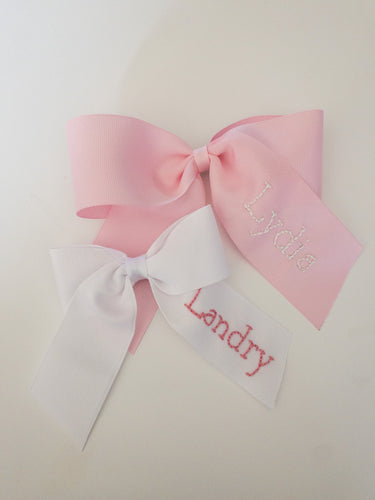 White Name on Light Pink Ribbon with Moonstitch